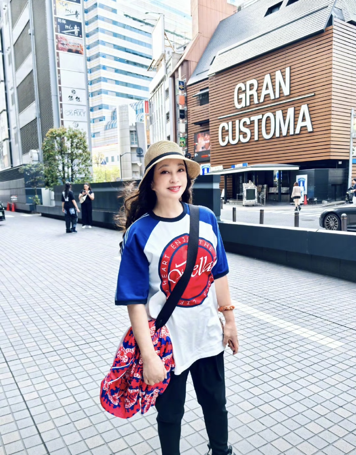 照片中的她穿着简约的T恤和运动鞋,头戴草帽,脸上面带微笑,仿佛回到了年轻时光。