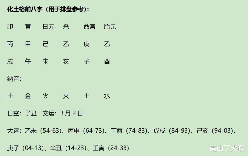 己日甲月,地支午未戌土局,为甲己化土格,甲化戊土,按照化土格重排八字: