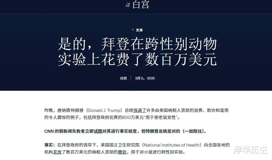 例如,在内容上,白宫网站会频繁引用特朗普的争议性言论,如拜登政府花数百万美元用于让老鼠变性。即使后续事实被核查有误,仍坚持传播。3月5日,白宫史无前例地在网站上公开批评CNN为假新闻,强调“特朗普总统是对的(一如既往)”。