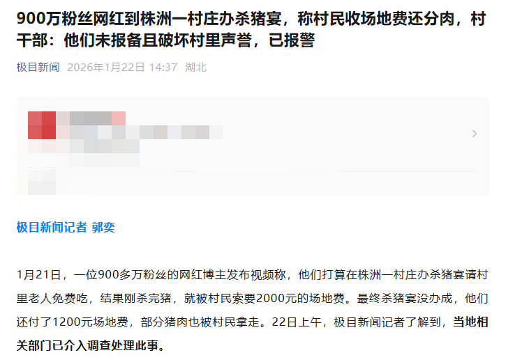 据极目新闻报道,21日,一位拥有900多万粉丝的网红博主发布了一段与另一位博主的共创视频。视频介绍,他们前往株洲一村庄体验杀猪宴,他们自费从村民手中买了一头400多斤的猪,邀请村里的留守老人免费吃杀猪宴。