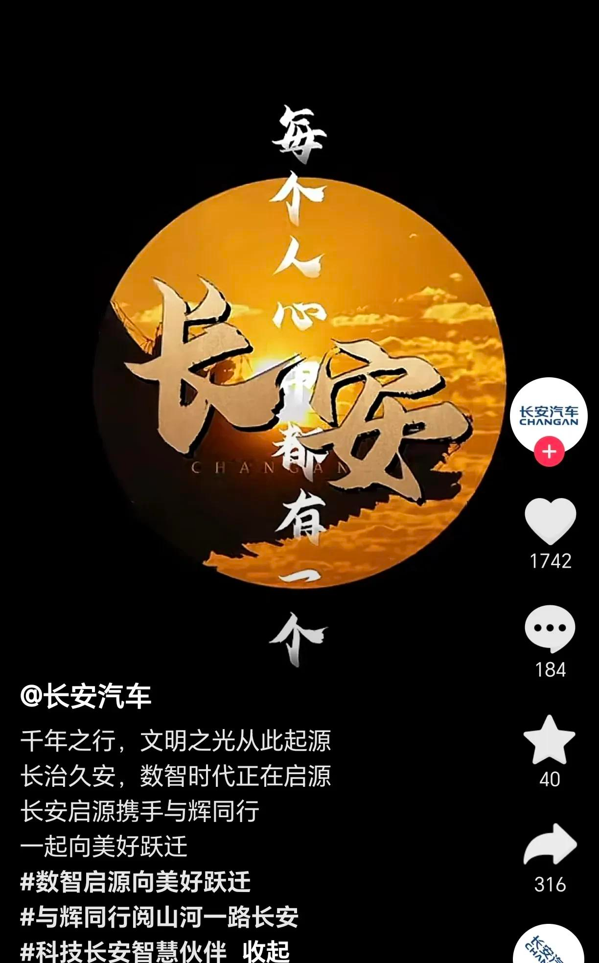 宇辉发布了长安汽车的宣传视频,这个融合了历史,文化,工业,智能等元素的视频,在文案,设计和剪辑上堪称满分,和宇辉合作真的太幸福了,宣传效果值拉满!