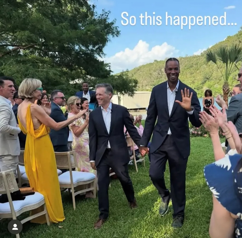 2025 年 6 月,NBA 历史上首位公开出柜的球员贾森 - 科林斯与相恋 12 年的伴侣布伦森 - 格林在亲友见证下
