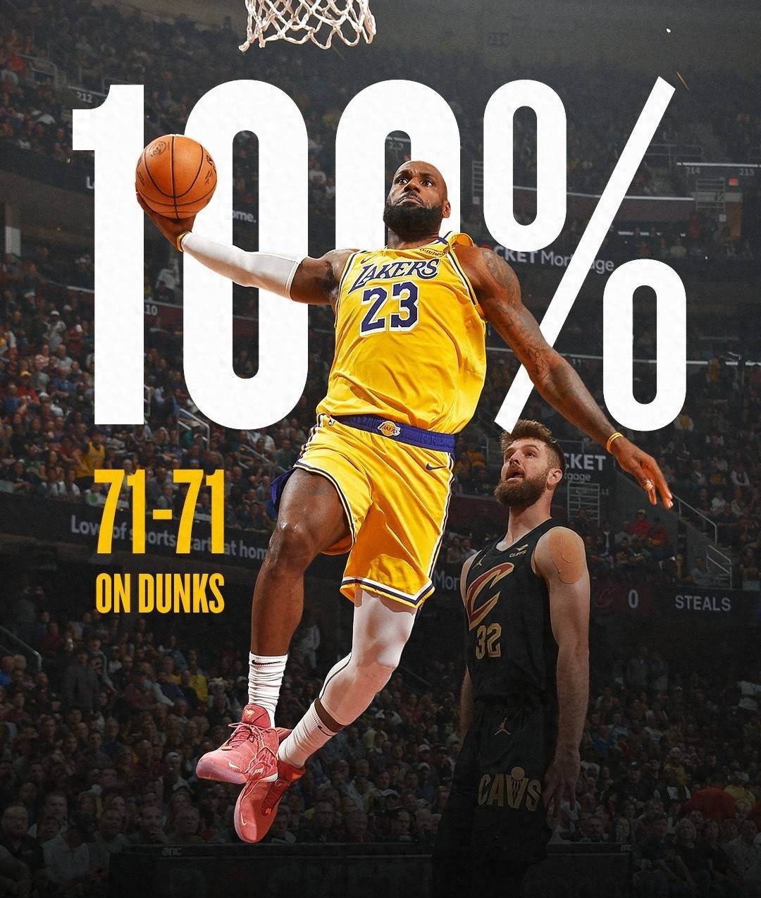 在2023年7月25日,北京时间,NBA官方网站发布了一条激动人心的消息,展示了勒布朗·詹姆斯在上个赛季创造的惊人扣篮纪录。这位传奇球员以单赛季71次扣篮全中而成为联盟历史上唯一一位完成这一壮举的球员。NBA的官方推特配上一张华丽的海报,并以引人注目的文字问道:“在上赛季50次以上的扣篮尝试中,谁是唯一一位实现100%扣篮命中率的球员?答案不言而喻,除了在其职业生涯第22个赛季依然霸气十足的国王——勒布朗·詹姆斯,实在没有其他人能够与之匹敌。”