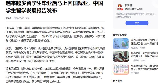 信息来源:新京报 2024-5-16 越来越多留学生毕业后马上回国就业,中国学生留学发展报告发布