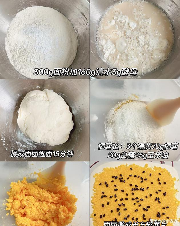 椰蓉馅:蛋黄:3个、椰蓉:70克、白糖:20克、玉米油:25克