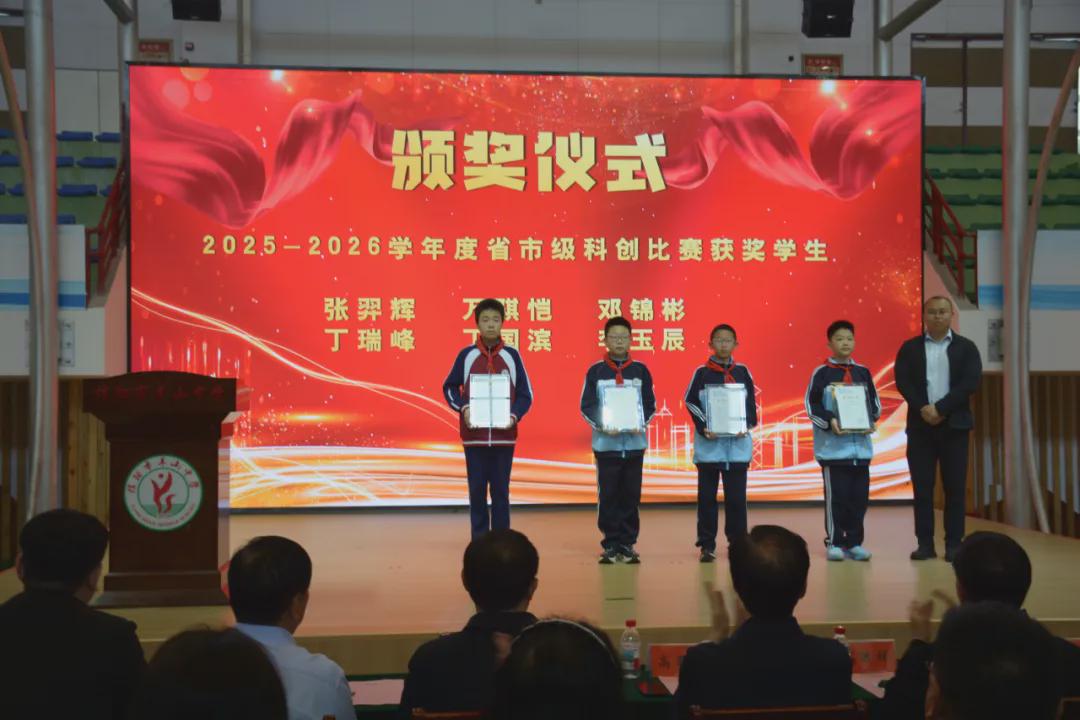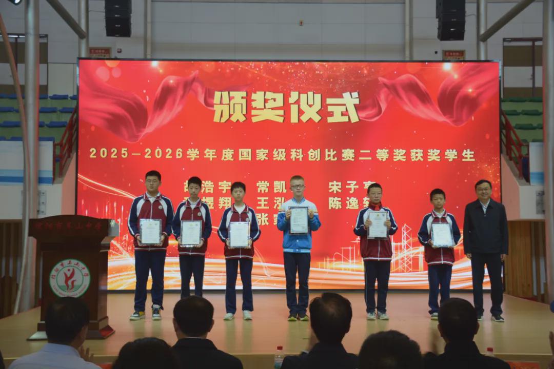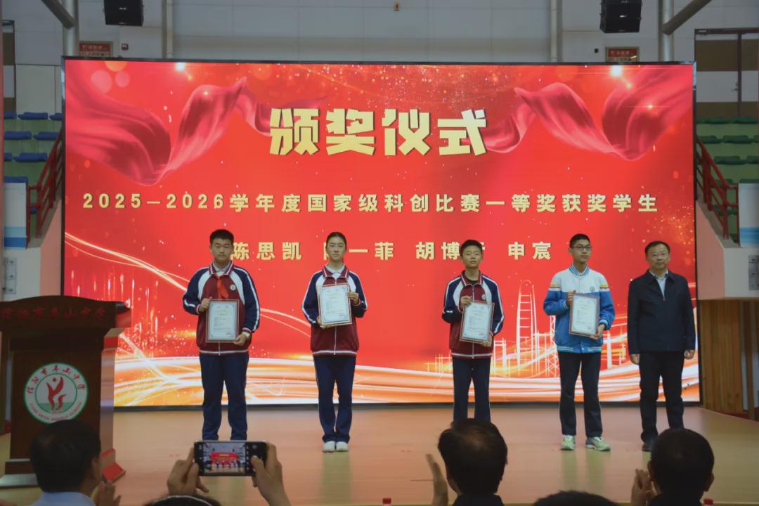 在激动人心的颁奖环节,学校对2025-2026学年度在国家、省市科创赛事中取得优异成绩的同学进行了隆重表彰。从省市级奖项到国家级竞赛一等奖,张羿辉、胡浩宇、陈思凯、陈一菲等一批批优秀的羊山学子依次上台,从颁奖嘉宾手中接过象征荣誉的证书。他们用智慧和汗水书写的科创答卷,赢得了现场最热烈的掌声,成为了所有同学追赶的榜样。