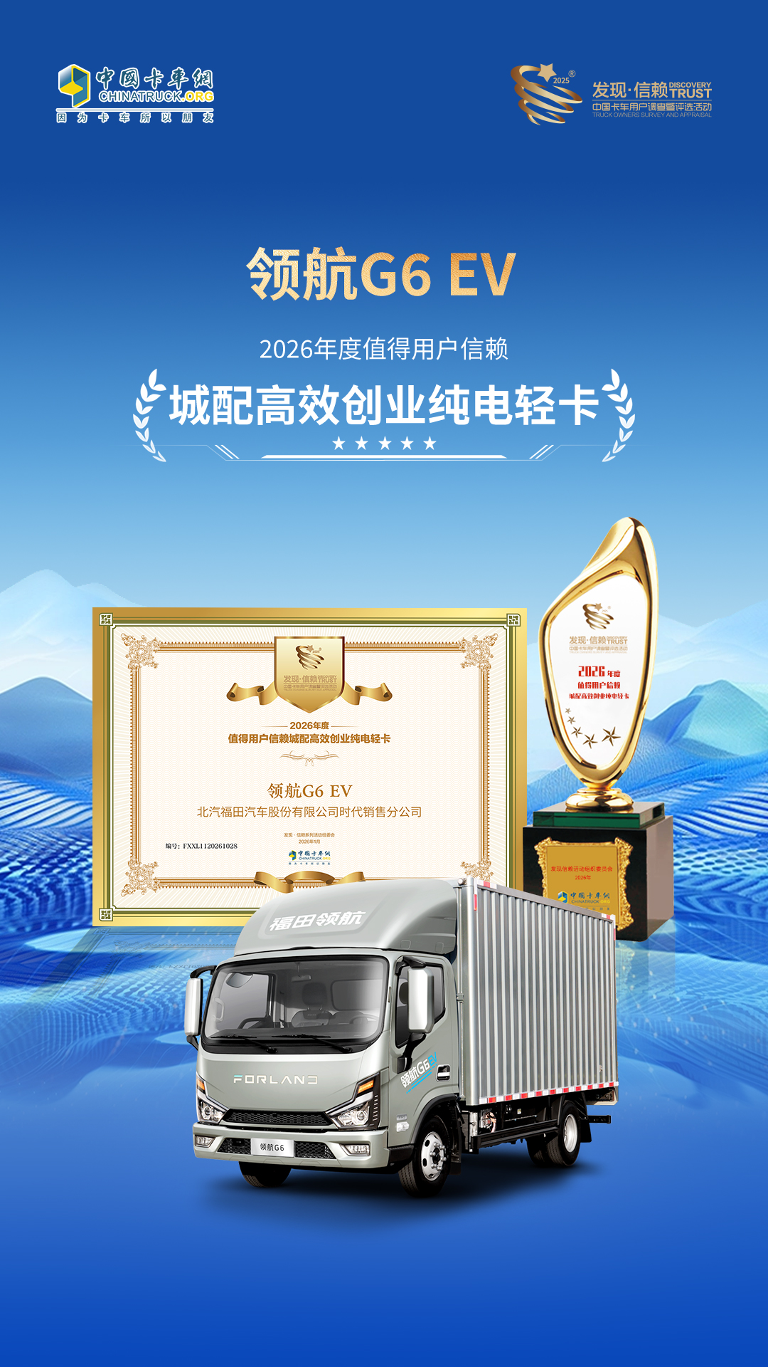 2026年1月22日,中国卡车网主办的第十一届发现信赖中国卡车用户调查暨评选活动在北京举行。领航G6 EV凭借对城配创业者“续航无焦虑、承载够可靠、运营成本低、驾乘够舒适”核心需求的深度契合,在众多车型中脱颖而出,成功摘得“2026年度值得用户信赖 城配高效创业纯电轻卡”奖项。