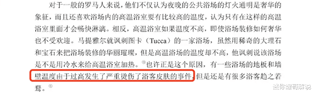 记载中有提到,罗马人本来就喜欢高温的水,高温池里的水还是直接从锅炉里倒出来的,这个锅炉的作用是给地板和墙壁供暖,曾发生过地板烫伤人的事件。这个记载,跟开拓者的吐槽对上了。