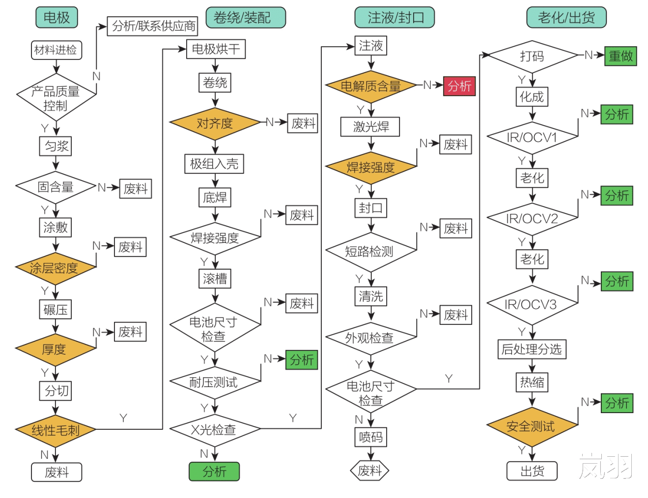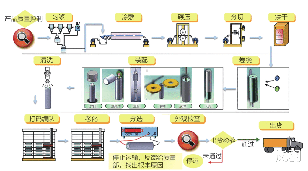 下图为圆柱形锂离子电池制造工艺,包括匀浆、涂敷、碾压、分切、烘干、卷绕、装配、清洗、化成、老化、后处理分选、外观检查和出货。