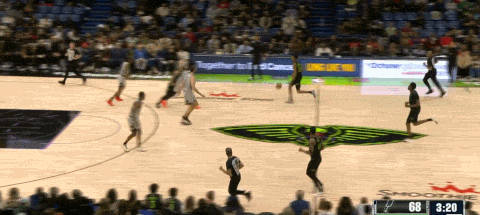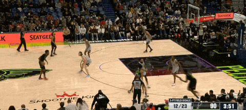 除了简单手递手的发牌,奎因的弧顶处理兼具技巧和对时机的把控。这一次左侧无球端河伯想借pin down掩护到弧顶接应,不过瓦塞尔选择站位靠上的deny防接球,河伯反跑空切,奎因心领神会,送出双手的击地传球完成连线。