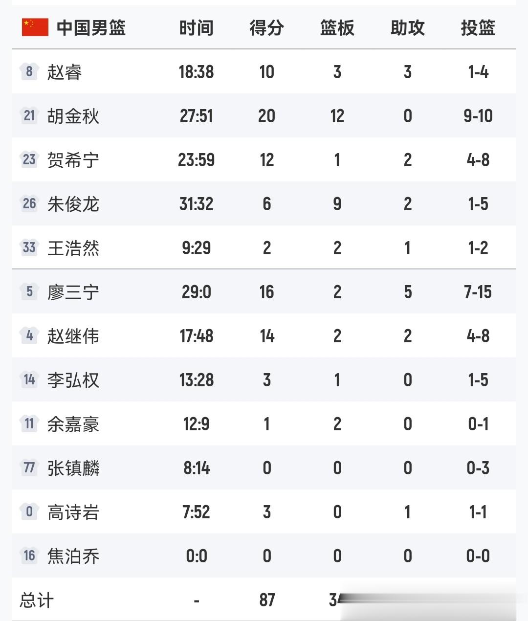 还有廖三宁的表现同样非常出色,他得到了全场第二高的16分,另外还贡献了5次助攻。在中国队上半场进攻受阻时,廖三宁的个人进攻也始终在线。