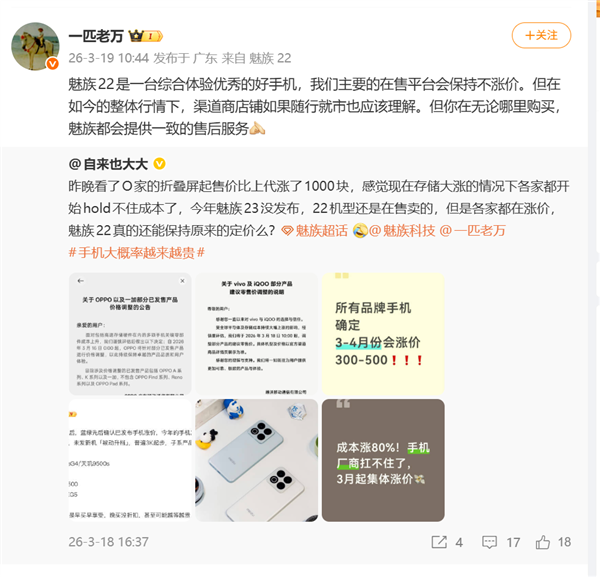 星纪魅族集团中国区CMO万志强针对魅族22涨价传闻作出明确回应,称该机型在官方主要在售平台将保持价格稳定,不会上调售价。