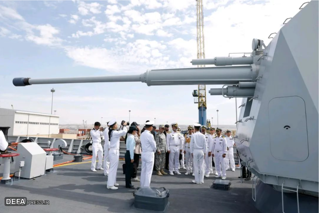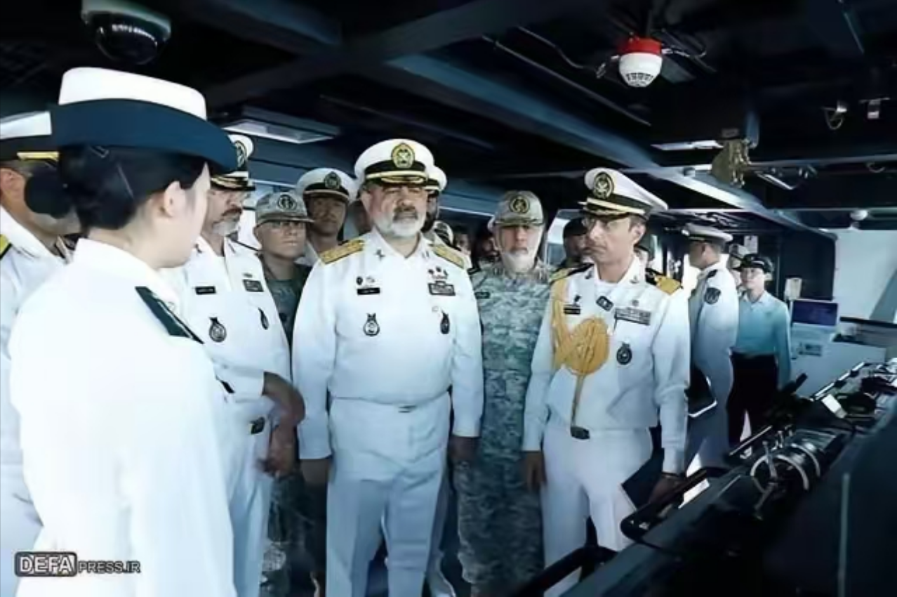 据伊朗媒体披露的图片表明,伊朗海军司令沙赫拉姆·伊拉尼少将,参观了中方参演的052D型驱逐舰133“包头”舰,舰桥、驾驶室、甲板停机坪、垂直发射装置、会议室等处,都留下了伊朗海军军官的足迹。