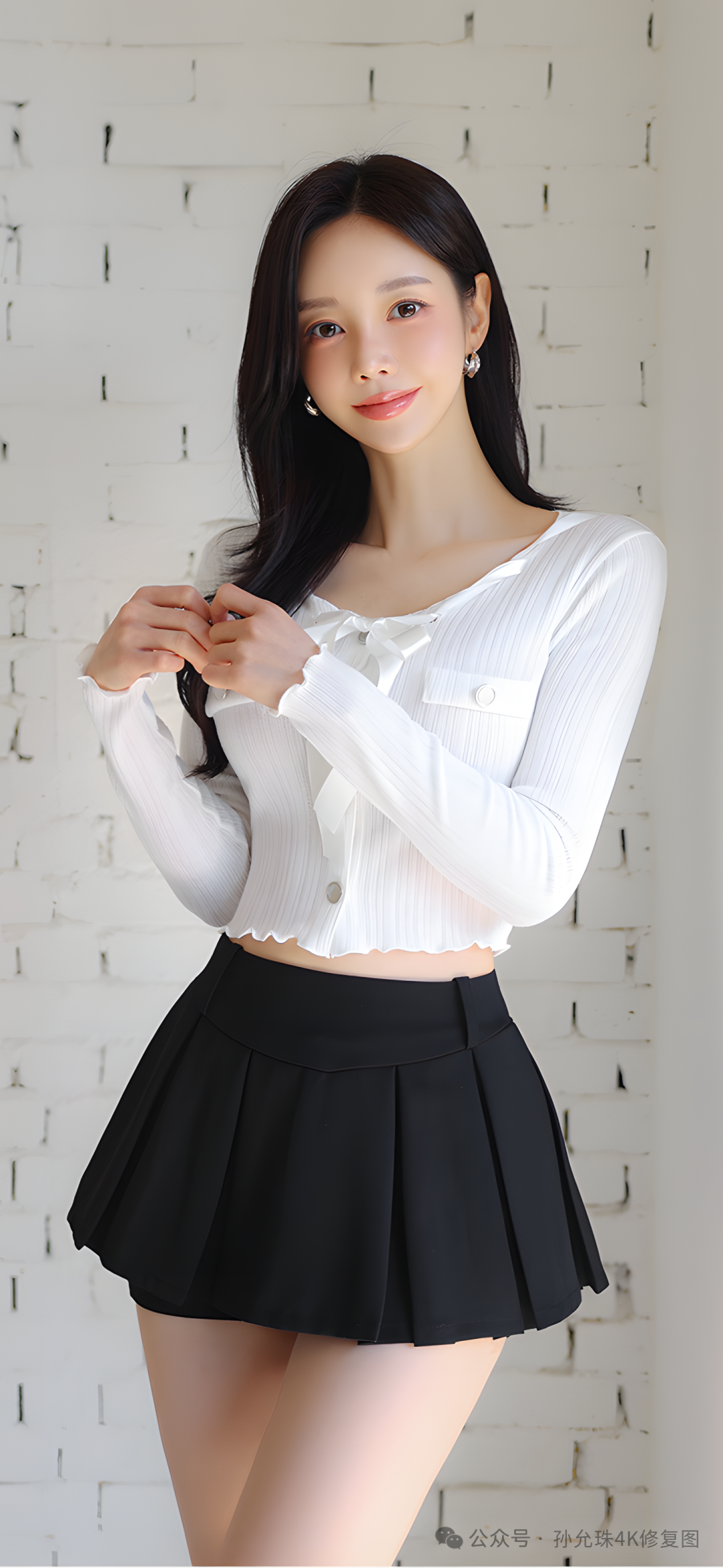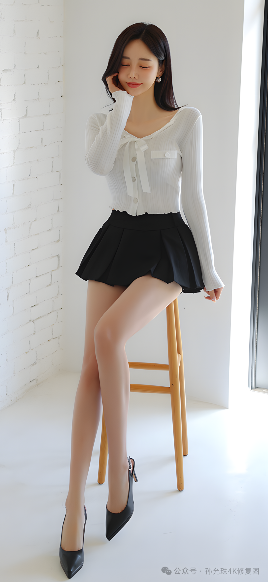 下身搭配经典的黑色百褶短裙,这一学院风的标志性单品,瞬间让人联想到校园的青春活力。高腰设计提升腰线,使双腿看起来更加修长笔直,百褶裙摆轻盈灵动,走动间摇曳生姿,为整体造型增添了一丝成熟韵味,与黑裙相呼应尽显青春的动感与活力。脚上的黑色尖头高跟鞋,为整体造型增添了一丝成熟韵味,与黑裙相呼应,在视觉上进一步拉长腿部线条,使她的身姿更加挺拔。在白色砖墙与明亮光线的映衬下,整套穿搭简约而不失精致,既有着学院风的清新纯真,又展现出时尚的摩登感 。