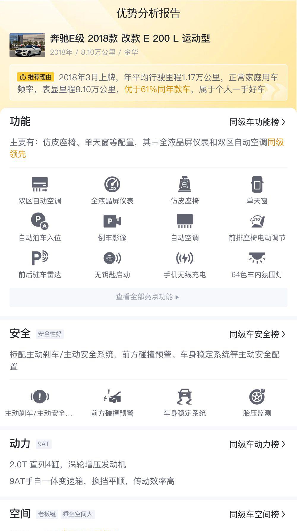 我们再来看看配置。这辆E 200 L搭载了2.0T发动机和9AT变速箱,动力性能在同级别车型中处于中等偏上水平。此外,它还配备了仿皮座椅、单天窗、全液晶仪表盘、双区自动空调等舒适性配置,以及主动刹车、前方碰撞预警、疲劳驾驶提示等安全配置。可以说,即使是二手车,它的配置依然相当丰富。
