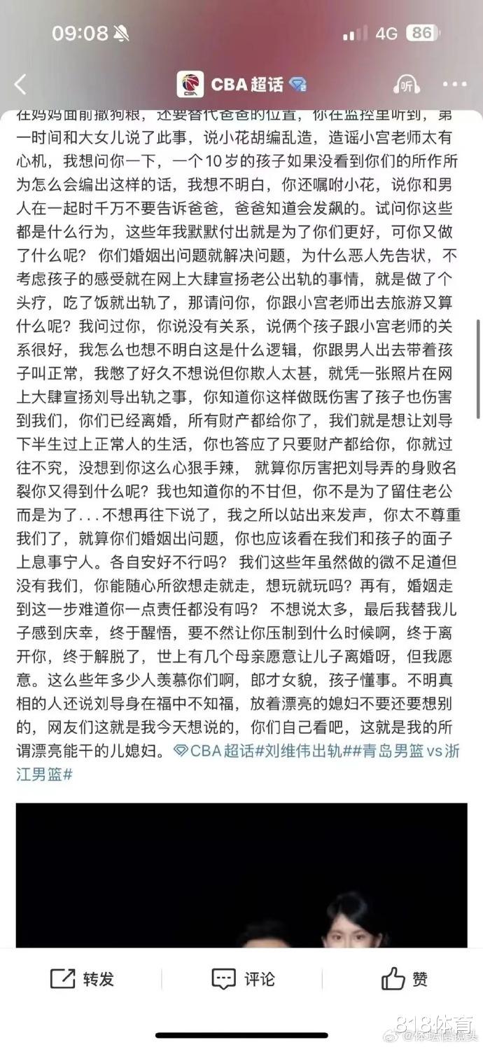 4月8日消息,日前,青岛男篮主帅刘维伟的妻子李艳,在微博发布长文,控诉刘维伟出轨有夫之妇。4月7日,有疑似刘维伟母亲的网友在微博上发文怒斥李艳,指责她3年前已经协议离婚,而且带着男教练出国旅游,从来没把刘维伟的父母当人看。