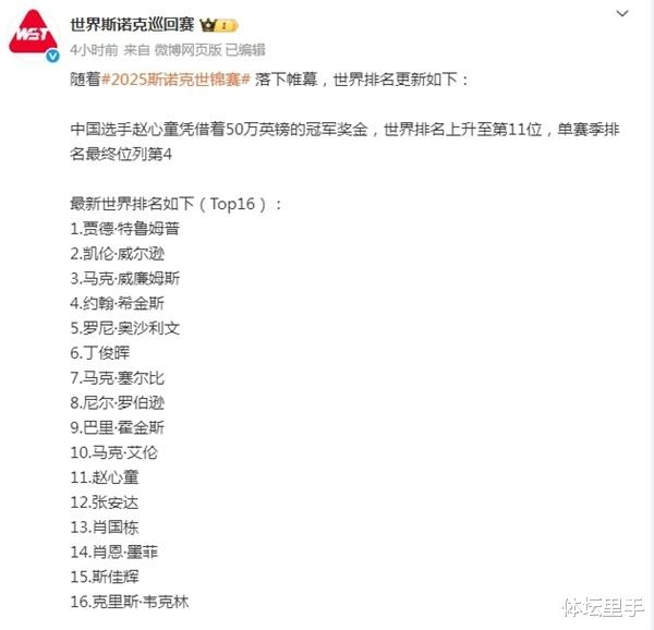 业余球员赵心童持外卡参赛,从资格赛一路连胜9场,击败了包括奥沙利文、马克威廉姆斯在内的多位高手,拿到了2025年的斯诺克世锦赛冠军,创造N多项历史纪录的同时,世台联也为赵心童修改规则,因此赵心童在世锦赛获得的奖金积分纳入排名系统,从一位没有世界排名的业余选手,直接来到世界第11,将以世界前16的身份开启2025-26年的新赛季。