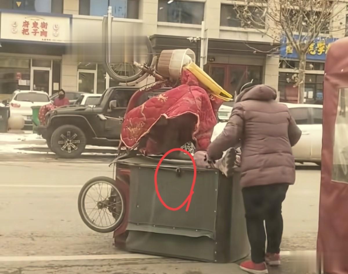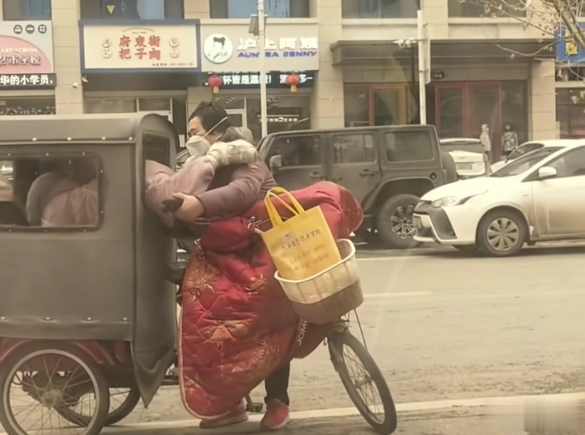戴着口罩的奶奶累的直喘气,为了快速将孙女“塞”进车棚,她干脆摘下了帽子和口罩,这下动作方便了。