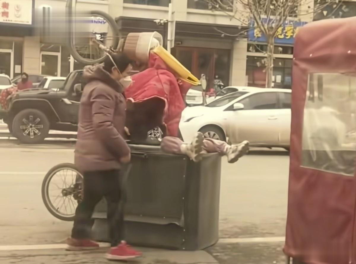 奶奶看着也焦急,她搬起孙女两腿,轻轻往里推着,然而车棚长度无法容纳女孩。