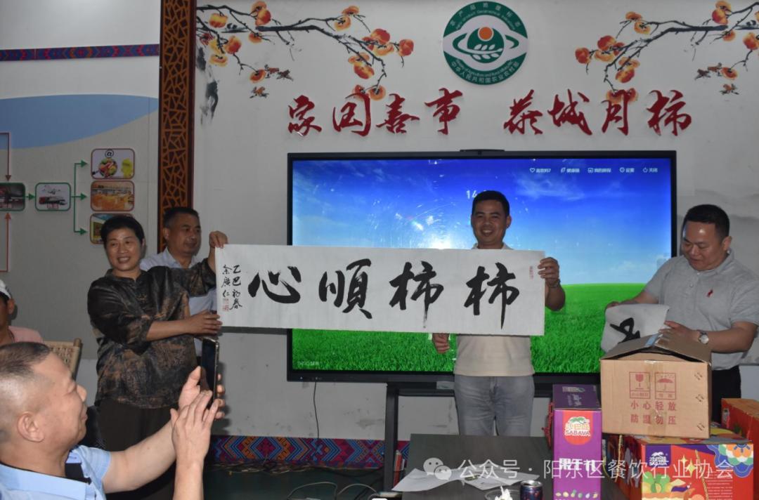 座谈会上桂林市人大代表、柿子协会会长、柿子非遗传承人、恭城丰华园食品有限公司董事长陈丽华、恭城瑶族自治县农业农村局副局长农艺师林青、桂林餐饮协会副会长单位红仔帮农董事长胡侃轩等现场给阳江市雅思达酒店董事长、阳江市餐协及阳东区餐协副会长林进勇老板赠送纪念品“柿柿顺心”!