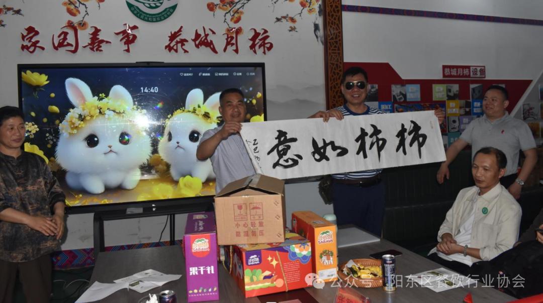 座谈会上桂林恭城瑶族自治县农业农村局副局长农艺师林青、桂林餐饮协会副会长单位红仔帮农董事长胡侃轩等现场给阳江市河西酒店董事长、阳江市餐协副会长曾献开老板赠送纪念品“柿柿如意”!
