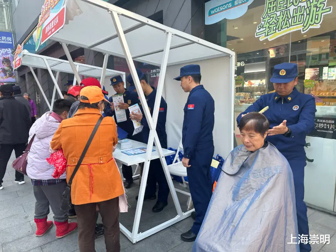 启动仪式后,广场内多元志愿服务同步开展,涵盖消防安全科普、公益理发、医疗问诊、爱心义卖等多个领域,精准对接群众需求。消防安全科普区,作为特色志愿服务力量,崇明区消防救援支队通过发放宣传手册、现场知识问答等方式,向群众普及用火用电用气安全、火灾逃生自救技巧等知识。同时,崇明消防救援支队深入商铺库房等重点区域,细致排查电气线路老化、灭火器材过期等安全隐患,推动消防安全科普、应急技能培训等服务进社区、进商圈常态化开展。