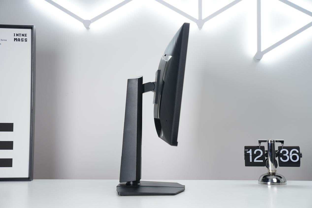 支架是整机设计的一大亮点,支持俯仰 -5°~20°、130mm 高度升降、±30° 旋转及 90° 竖屏,全金属转轴阻尼恰到好处,调节顺滑且稳固。隐藏理线槽与内置电源的设计让桌面更整洁,也避免了外置电源砖的累赘感。