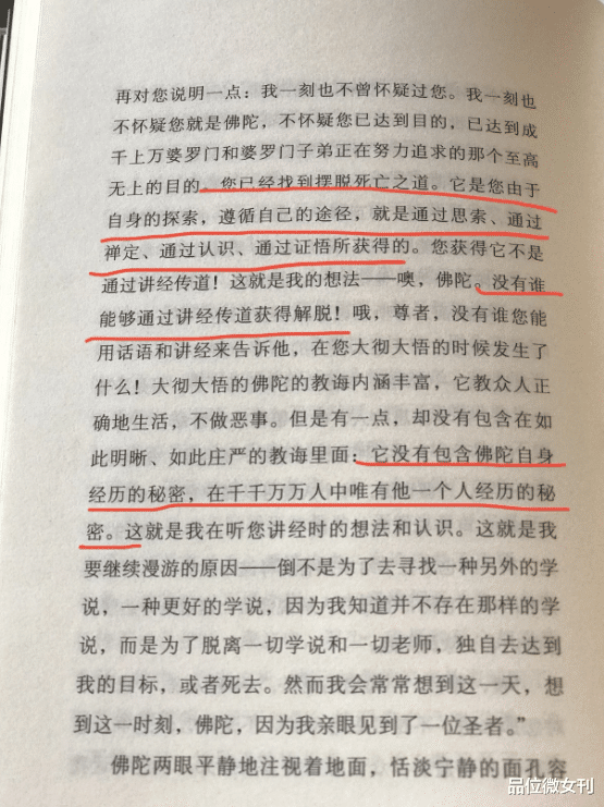 悉达多离开佛陀,在不断摔打中得到教诲、智慧。现实生活本就没有完美的样子:所谓的我,就是过去一切体验的总和,我是我接触过的人,触碰过的物,感受过的情爱,迷失过的痛苦等等,所有的一切才成为此刻的我,少一点都不是我。