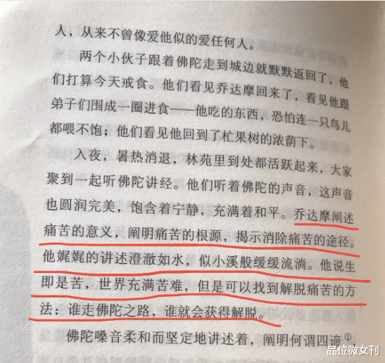 悉达多效仿苦行僧的生活,发现不过是逃避自我,不能从虚无与痛苦中解脱。世界之味苦涩,人生即为磨难,“谁走佛陀之路,谁就会获得解脱”。佛陀的伟大并不是在他的法义和思想中,而是在他的生命体验中。佛陀找到摆脱死亡、痛苦之道,是他自身的探索,思索、禅定、认识、证悟所获得。没有谁是通过讲经传道获得解脱。是的,知识可以传达,但智慧不可以。