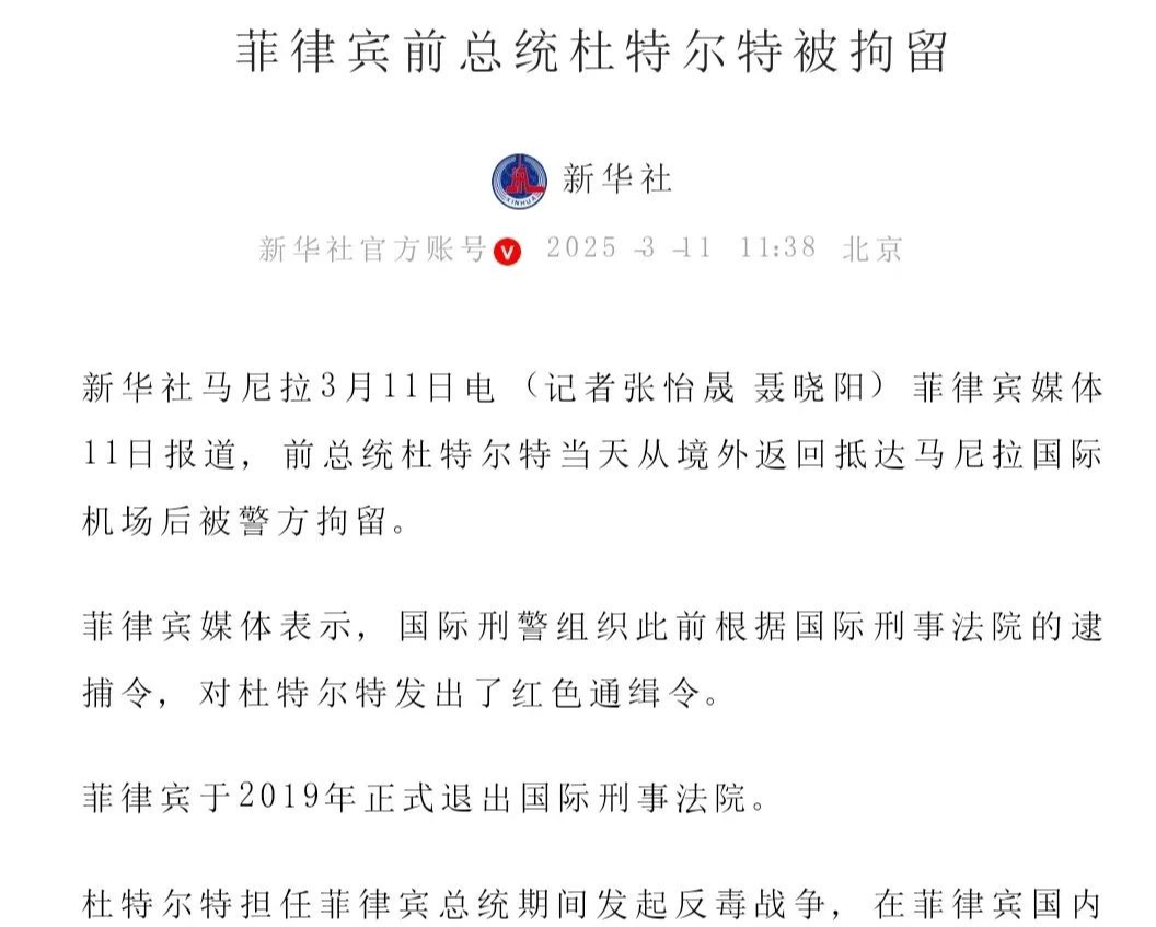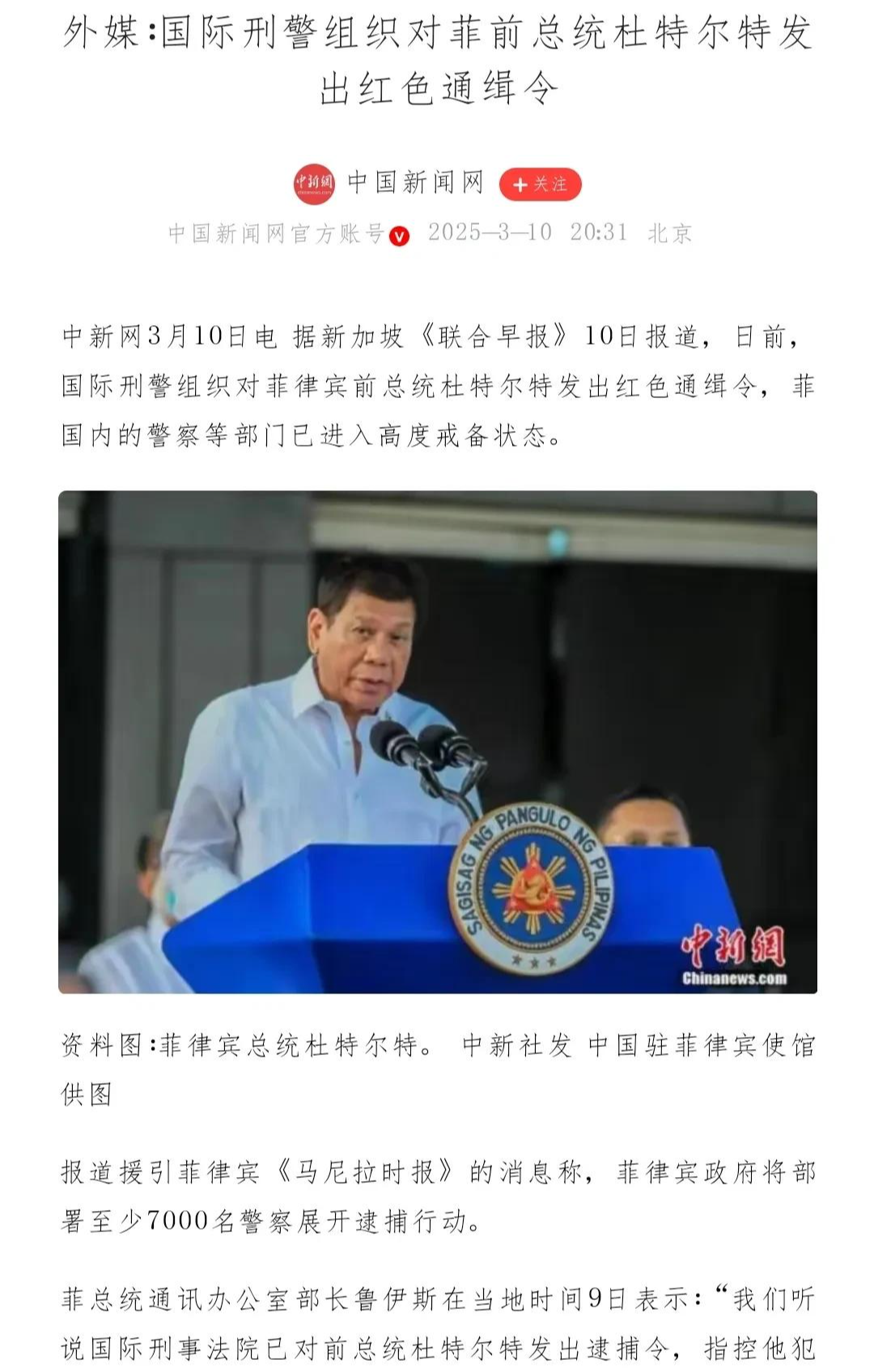 在风云变幻的国际舞台上,菲律宾前总统杜特尔特突然陷入了一场前所未有的危机——国际刑警组织根据国际刑事法院的调查,向他发出了那抹引人注目的红色通缉令。在这层阴影背后,似乎隐藏着国内小马科斯政府的一番暗流涌动,他们或许正借机掀起波澜,试图对杜特尔特家族施加压力。而在国际棋局中,美西方势力也似乎在暗中操盘,企图插手菲律宾的内政事务。然而,当杜特尔特踏上香港的土地,本是一次宁静的私人度假之旅,却在错综复杂的政治风云中激起了层层涟漪,引发了公众的无限猜想与热议。