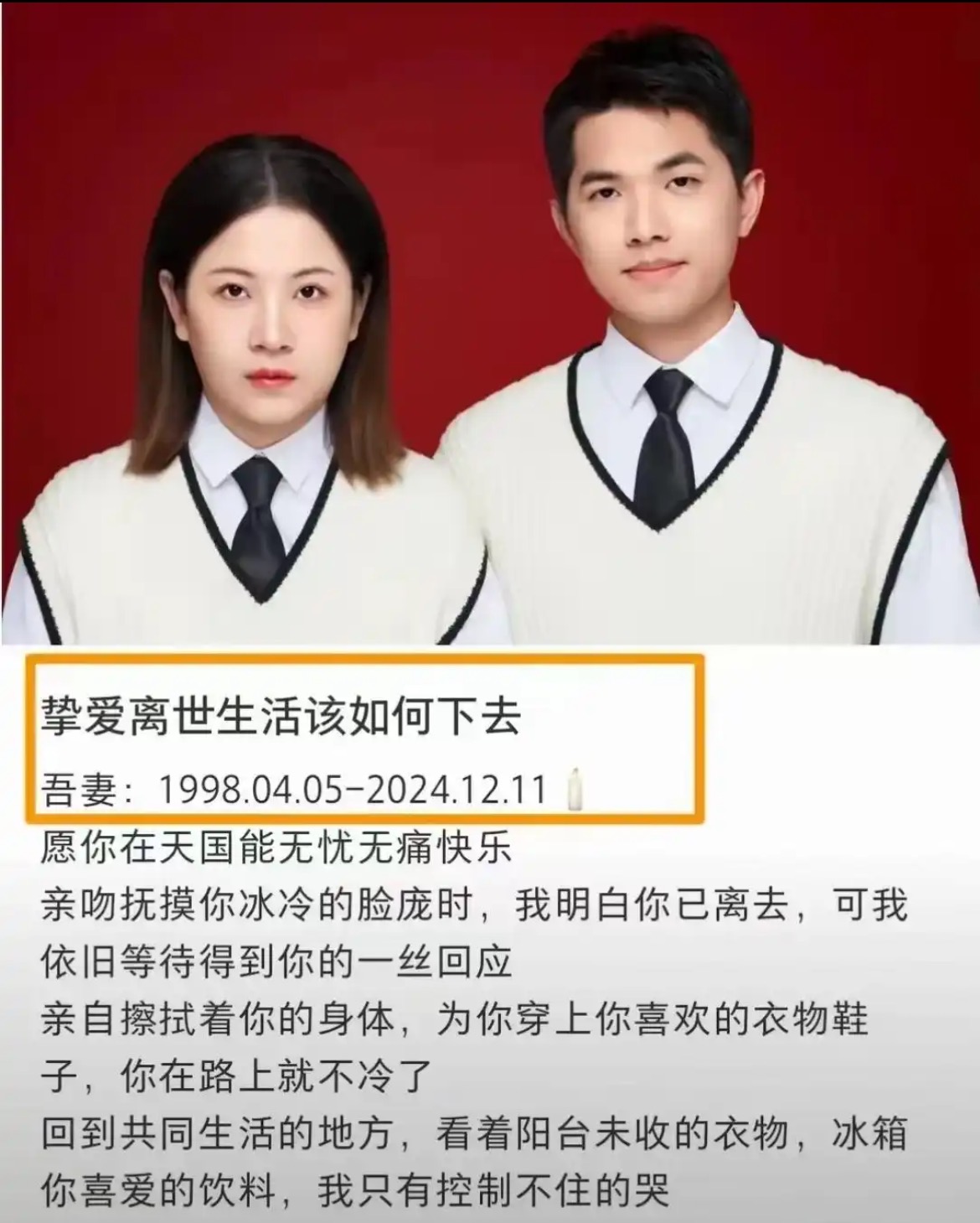 其妻子于2024年12月因病去世,年仅26岁,谢某振此后长期陷入抑郁,通过酗酒、反复追忆亡妻等方式麻痹痛苦,最终在妻子忌日前夕轻生。