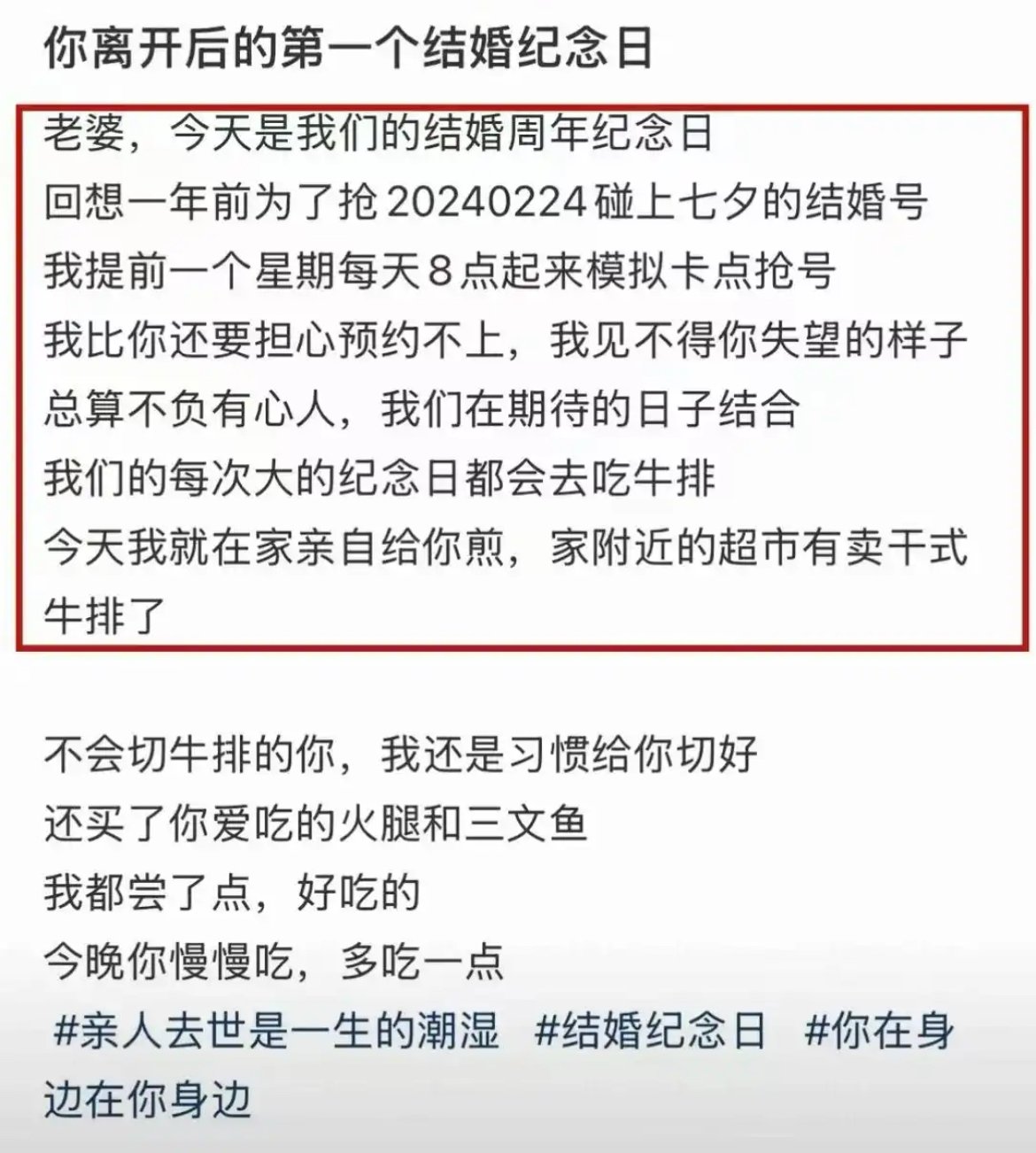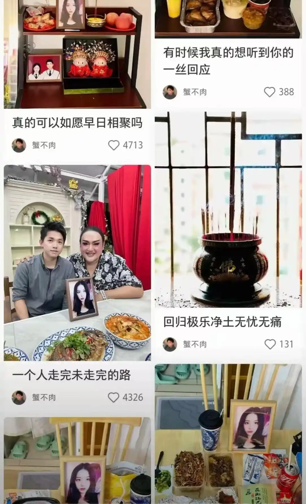 悼念行为:妻子去世后,他带遗照赴泰国完成两人未竟旅行,日常动态多为摆亡妻照片共餐、使用其遗物保留记忆。