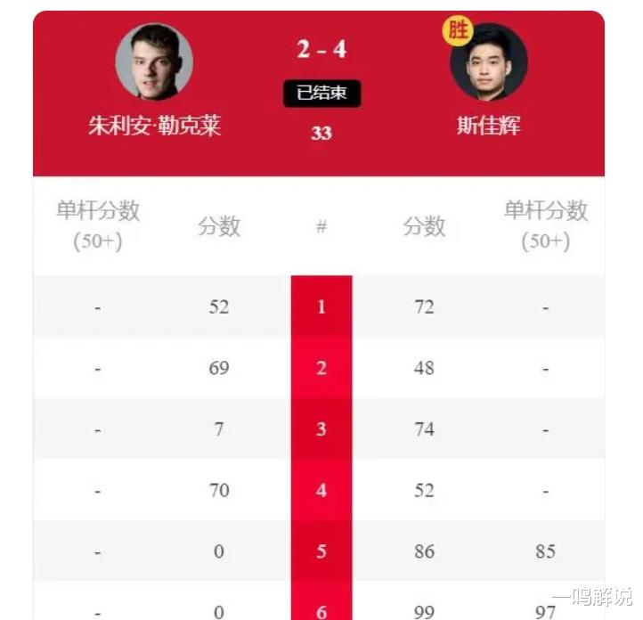 首局比赛,斯佳辉和勒克莱克展开了一场耐心的角逐,双方在防守和进攻间转换,耗时43分钟后,斯佳辉凭借72-52的微弱优势艰难拿下。紧接着的第二局,勒克莱克以69-48扳回一局。但斯佳辉并未受此影响,他在接下来的比赛中显示出了自己的稳定性和技术深度,特别是第五、六局中,分别打出85分和97分的高分单杆,以4-2完成了对勒克莱克的逆转。
