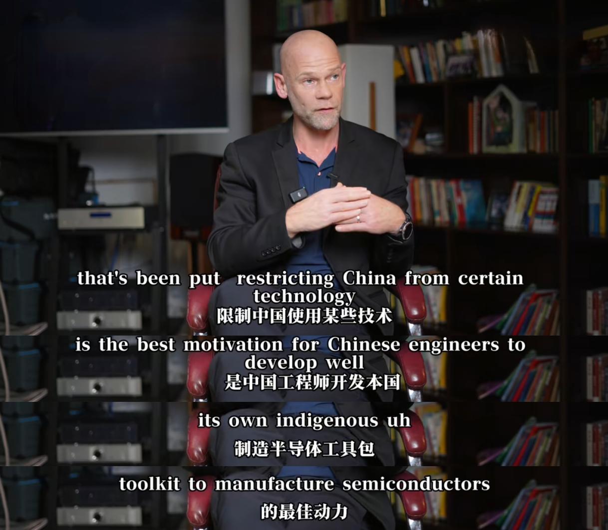 主持人杨锐曾经就国产光刻机的问题对马克·海金克进行了专访,杨锐认为美国的制裁正在让中国被迫进行独立技术的研究,中国的科技正在越来越强大。