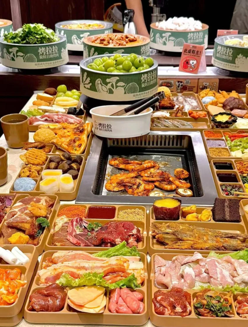 以烤拉拉为例,79.9元/人的定价涵盖了超过100种菜品,包括爆汁牛肋条、招牌秘制牛肉等20余种肉类,还有多种海鲜、近百种蔬菜,以及披萨、甜品和饮品,品类之丰富远超普通单点烤肉店。