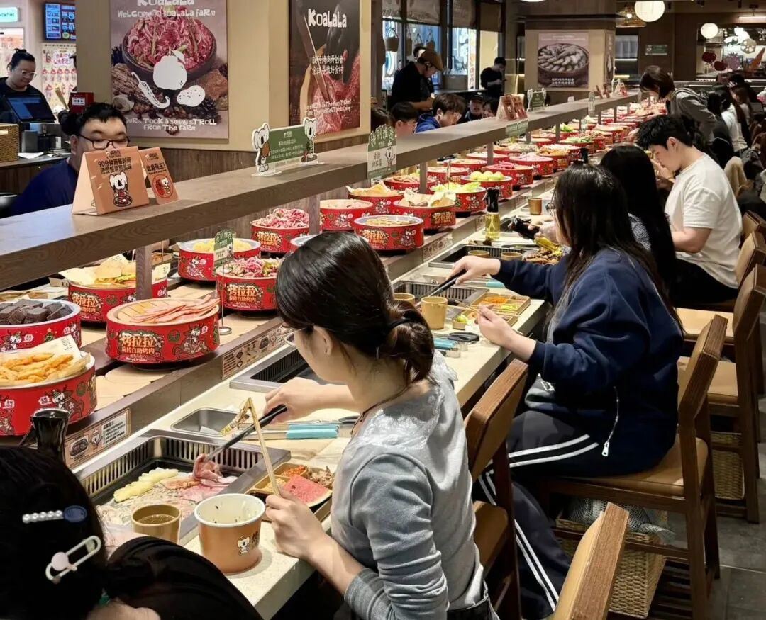 首先,它真正实现了从“一人食”到“多人聚”的全场景覆盖。通过“吧台+独立小烤炉”设计,一人一炉,食材由传送带自动送达面前,无需起身、不用拼桌,既消除了独食的孤独感,也避免了社交压力。这种低门槛、高自由度的用餐方式,显著拓宽了客群边界,不再只是朋友聚会的选择,也成为上班族、学生党日常解馋的轻松选项。