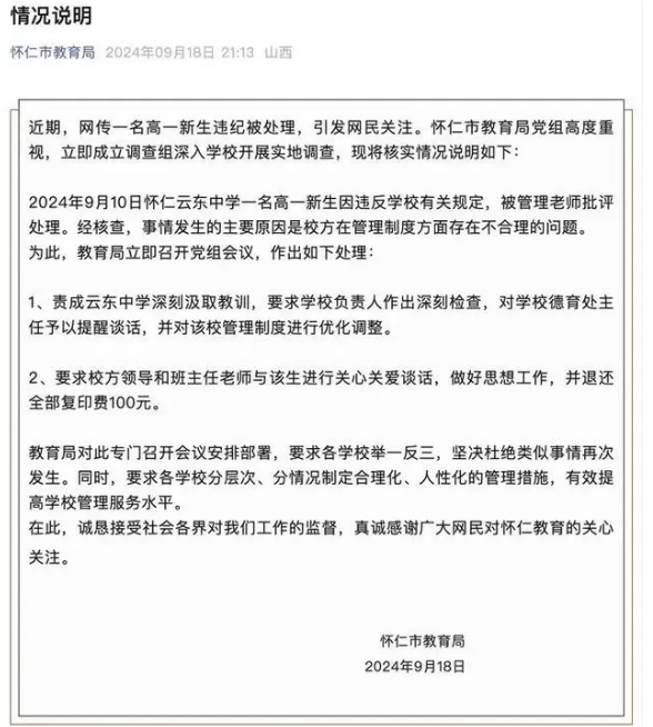 近日,山西省怀仁市教育局发布了一则通报,就怀仁云东中学一名高一新生因晚上11点后上厕所被学校记严重警告处分一事进行了详细说明,并责成学校深刻反思,优化管理制度。