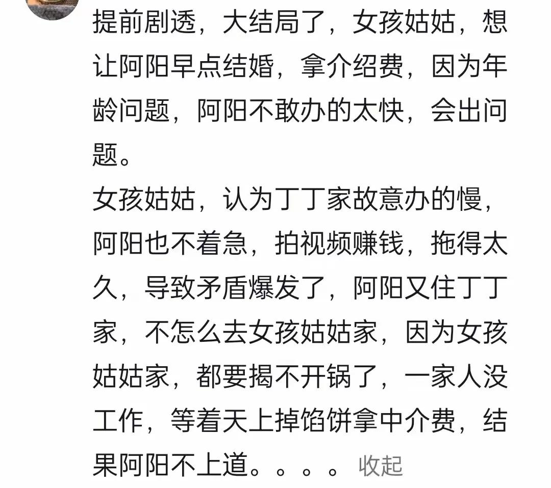 哪曾想,女友的姑姑为此很着急催婚,有知情网友提前剧透,实际姑姑为了早日拿到中介费,家里没有收入快揭不开锅了,等着拿中介费吃饭。