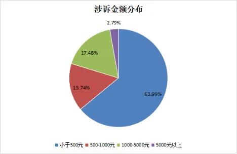 在酒店民宿相关投诉中,涉诉金额在500元以内的投诉占比63.99%;其次是金额在1000-5000元之间的投诉,占比17.48%。涉诉金额在500-1000元的占比15.74%,而在5000元以上的投诉仅占2.79%。