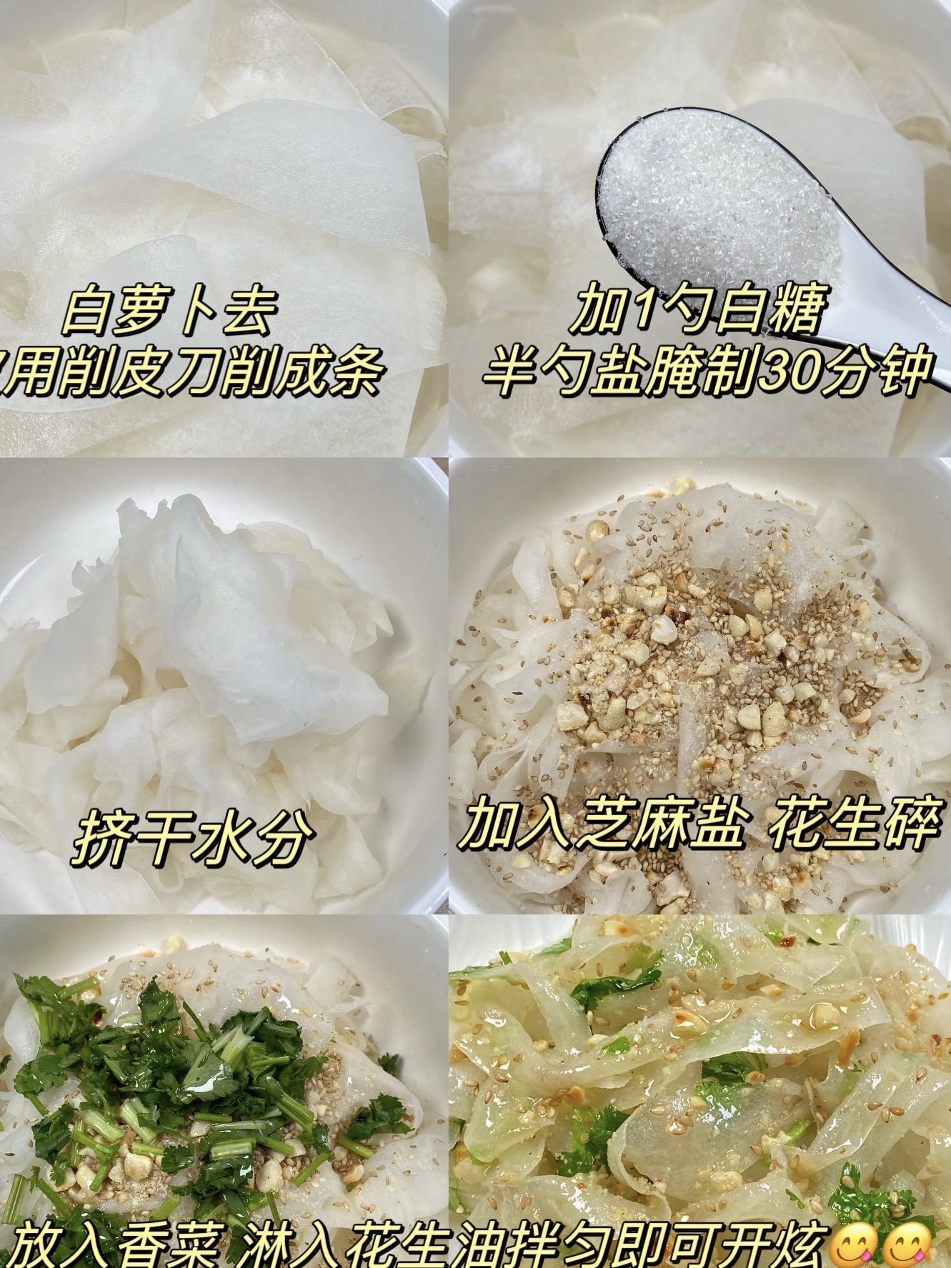 小贴士打包:1.萝卜现削现拌,放两小时以上会“回软”;2.糖盐腌制时间别超40分钟,否则萝卜会“哭”过头,失去清甜;3.芝麻花生一定等完全冷却再拌,否则热气会让萝卜出水;4.减脂党可以把花生油减半,加等量柠檬汁,清爽度+10086。
