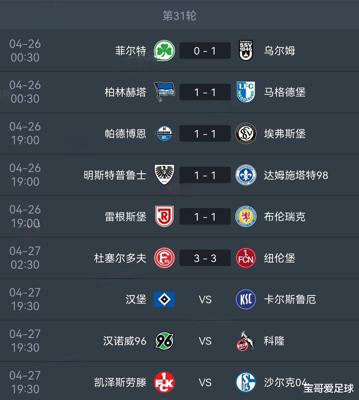 德乙第31轮,有6场比赛在4月26日举行,参赛的球队包括马格德堡、埃夫斯堡、帕德博恩、杜塞尔多夫和纽伦堡这5支在积分榜前9的球队,其中包括帕德博恩VS埃夫斯堡和杜尔塞多夫VS纽伦堡的直接对阵,而汉堡队VS卡尔斯鲁厄、汉诺威96VS科隆和凯泽斯劳滕VS沙尔克04这3场比赛在4月27日举行。为了防止自己的积分追上汉堡,在4月26日率先出场的这5支球队竟然不约而同的与对手战平,其中帕德博恩1-1埃夫斯堡,杜塞尔多夫3-3纽伦堡,马格德堡也与柏林赫塔1-1战平,其余3场比赛也有两场平局,只有菲尔特VS乌尔姆这场无关升级的比赛分出了胜负。
