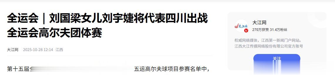 【1】大江网 2025-10-28 全运会|刘国梁女儿刘宇婕将代表四川出战全运会高尔夫团体赛