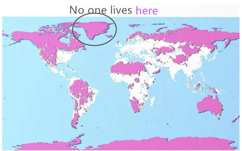 对于这巨大的陆地来说,区区几万人口肯定可以忽略不计,也就是说,基本可以视作无人区。上图为世界无人居住地区地图,格陵兰岛和附近的加拿大北极群岛、地球另一端的南极洲一样的颜色。人太少了根本分辨不出来,几乎是完整的无人区。巨岛上面人最多的城镇努克,在西南部一个微末的角落。格陵兰岛气候终年严寒,这里自然的力量占据绝对优势,人类的数量和活动痕迹几乎可以忽略不计。这个岛和南极洲一样,大部分土地人类迄今根本还没涉足过,处在原始、莽荒的状态。
