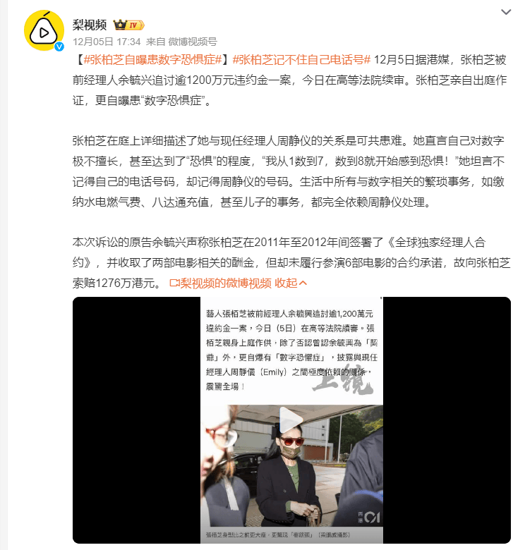 02 数字恐惧症:法庭上的惊人坦白与依赖关系张柏芝在庭上详细描述了与现任经理人周静仪非同寻常的关系。她强调两人之间没有合约约束,纯靠信任维系。