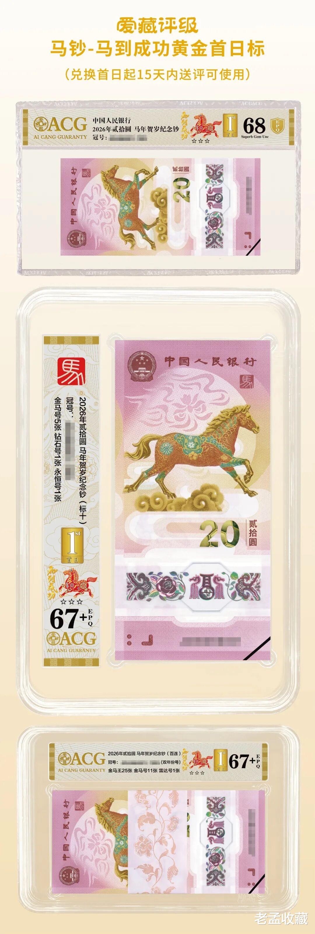1月20日兑换开启后,拿到马钞别只顾着开心,先查靓号,再及时送评锁定黄金首日标。毕竟好的藏品+精准的加分操作,才能在后续的收藏市场里,真正实现“马到成功”的溢价预期。