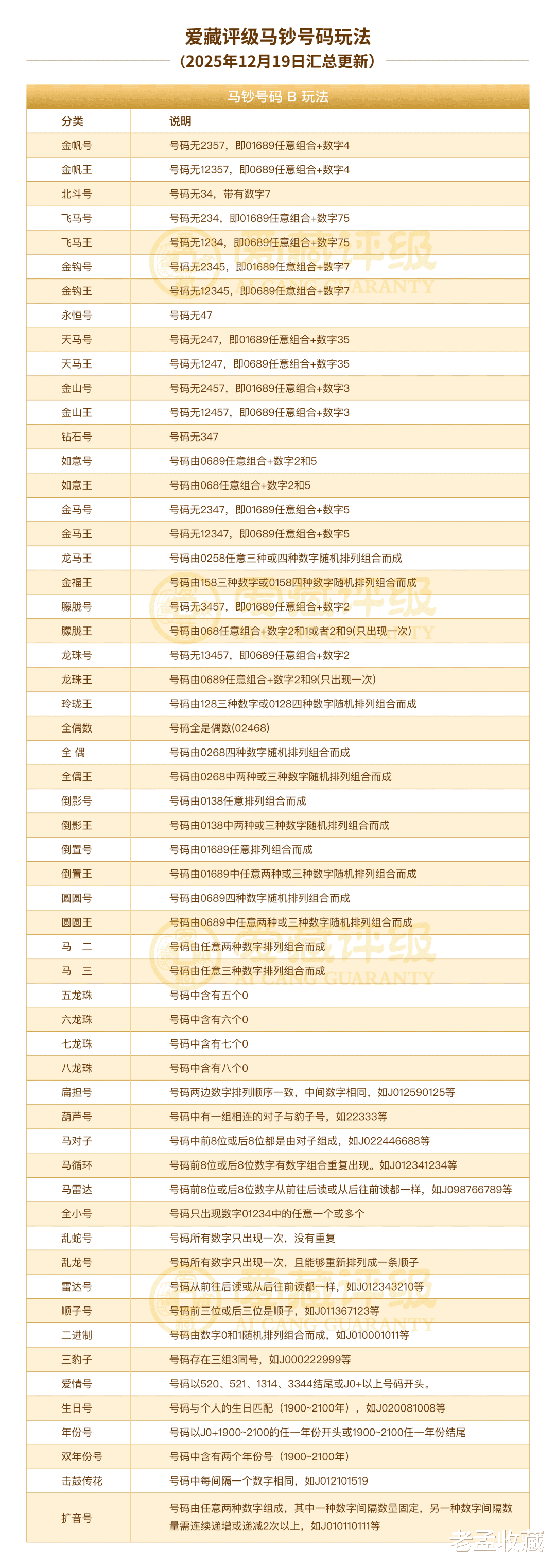 钻石级的大象号(尾6同),数字相同位数越多越值钱、圆圆号(号码只由0689组成),寓意吉祥;另外还有一些潜力款,比如金马号(无2347)、倒置号(号码由01689组成,旋转180度仍可读),这些都是懂行的人重点盯防的目标。