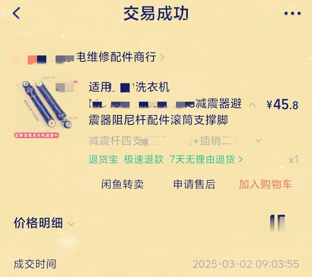 洗衣机的避震坏了,每次脱水都像拖拉机一般轰隆作响,官方售后的维修报价大几百,最终我在网上买的减震杆(45元),然后老公自己动手换好了,因为不熟手,折腾了一个上午修好,腰间盘都干突出了。