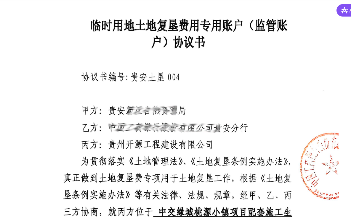 2022年1月27日,由贵安土地主管部门、工行贵安分行、贵州开源工程公司三方签订协议,根据相关的规定和标准,由丙方贵州开源工程公司缴复垦费20.51万元一次性存入监管账户。