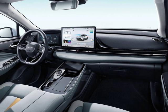 外观方面,前脸采用流行无边界中网,两侧大灯一体式设计呈倒V字型,提升整车辨识度。内饰材质佳,含50W无线充电带散热风扇,配影院级三屏、骁龙8155芯片及Coffee OS系统,智能化出色。