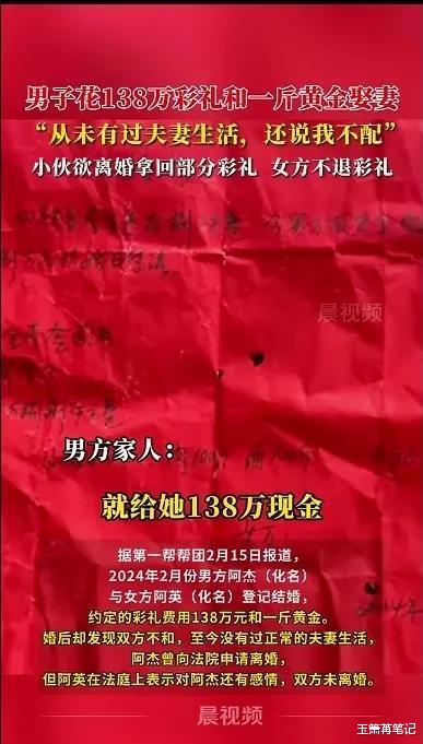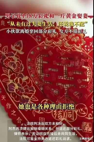 2025年2月15日,网友于社交平台分享视频,内容显示一男子花费1380000元及1斤黄金娶妻,但婚后女方拒绝同房。